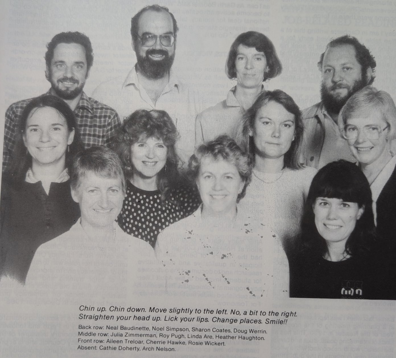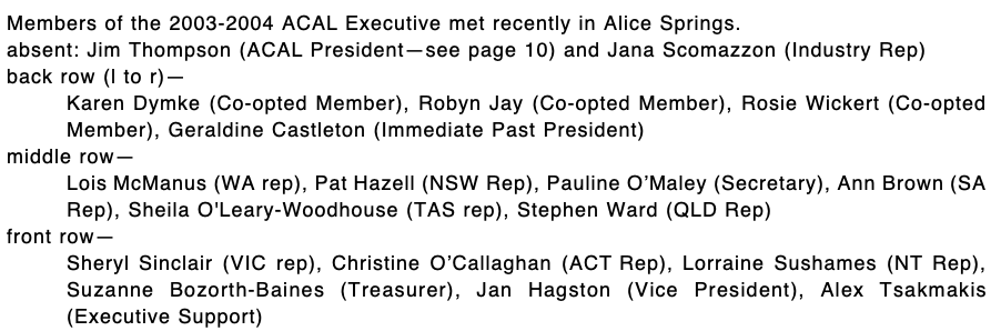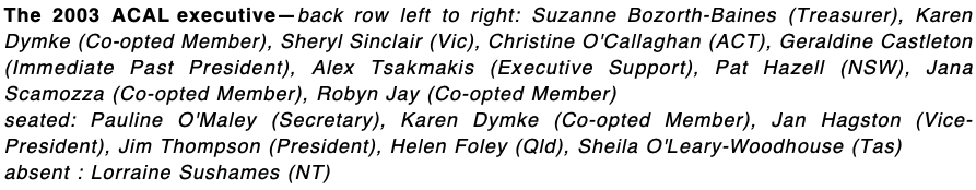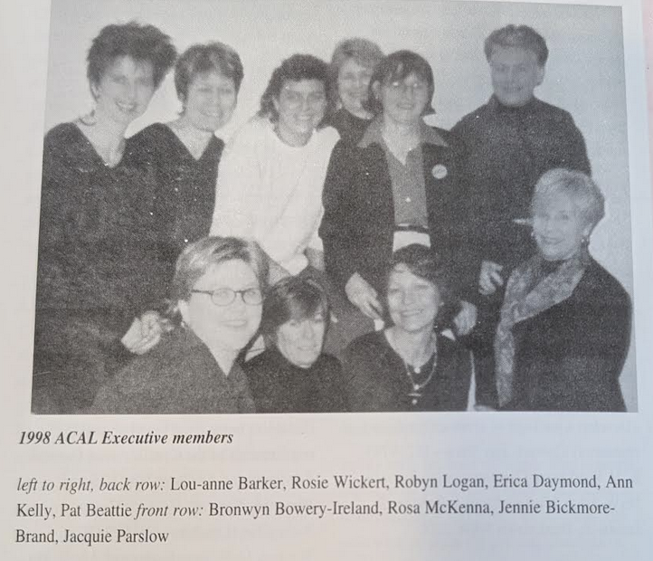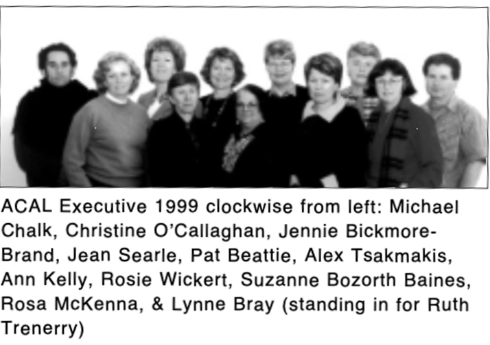ACAL Executive 1999: Back row l. to r.: Michael Chalk, Jennie Bickmore-Brand, Christine O’Callaghan, Jean Searle, Pat Beattie, Alex Tsakmakis. Front row l. to r.: Ann Kelly, Rose McKenna, Suzanne Bozorth-Baines, Rosie Wickert, Lynne Bray. Tell us if you know otherwise.