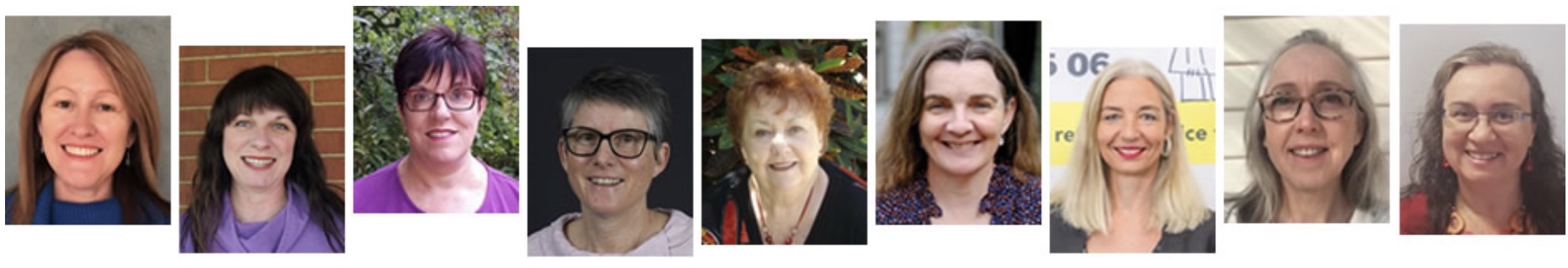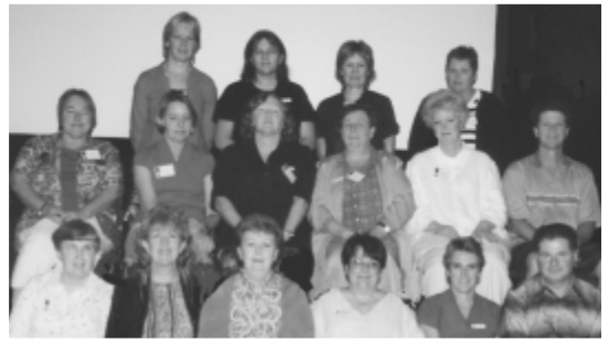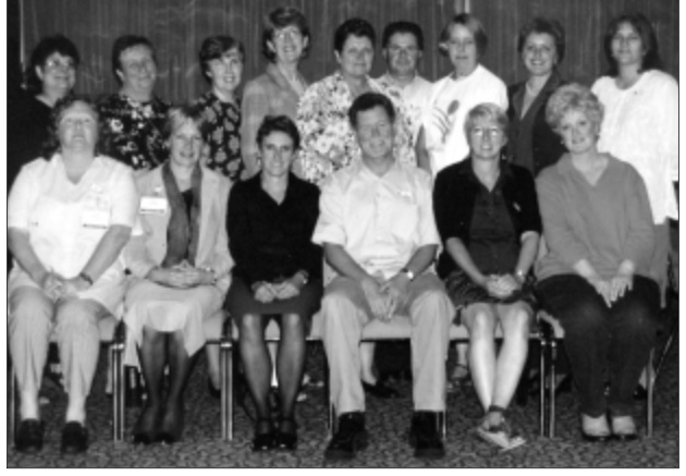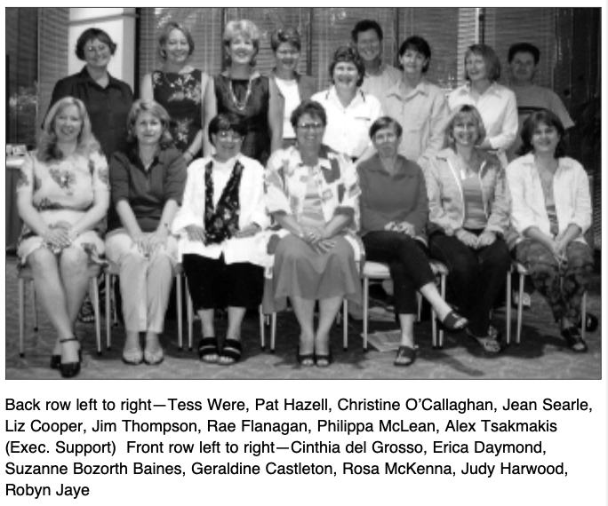 Back row: Jane Gunn? (SA rep); Ian Falk (NT rep); Margaret McHugh (President); Pauline O’Maley (Immediate Past Co-President); Lynne Matheson (VIC rep): Don MacDowall (Administration). Centre row: Wendy Strothers (TAS rep); Lorraine Sushames (Treasurer); Jan Hagston (Immediate Past Co-President): Front Row: Jakki Bourke? (Tas rep); Christine Doemling (NSW rep); Christine O’Callaghan (ACT rep); Robyn Jay (Vice-President).